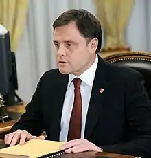 Vladimir Sergeyevich Gruzdev (Russian: Владимир Серге́евич Груздев, born 6 February 1967 in the village of Bolshevo, Moscow region, RSFSR, Soviet Union) is a Russian entrepreneur and a politician. He was a deputy of the State Duma (2003-2011) and governor of the Tula Oblast (2011-2016).[1] Since December 2016 - Chairman of the Board of the Association of Lawyers of Russia.