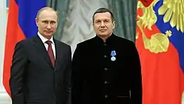 Vladimir Rudolfovich Solovyov[lower-alpha 1] (Russian: Владимир Рудольфович Соловьёв, born 20 October 1963) is a Russian TV presenter and propagandist.[9] He has been an anchor on the television show Evening with Vladimir Solovyov on Russia-1 since 2012.