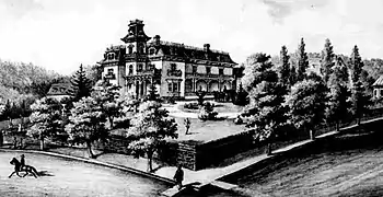 The house was later enlarged with an extended wing and another floor added with mansard roofs in the Second Empire style with these later additions made by architect William P. Lewis.[18] The back of the house faced what is today SW Broadway and its large two-story circular peaked greenhouse was located at the corner of Broadway and Jefferson.[19]