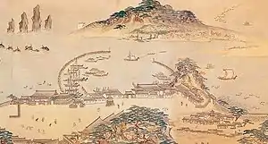 Unlike the Ming Dynasty's policy of haijin (restricting maritime trade), Korea permitted free entry of ships into its ports. As a result, trade between the Joseon and Japanese feudal lords increased rapidly. When Joseon harbors became targets for wokou pirates, in 1407, King Taejong restricted Japanese ships to the ports of Busan, Naei, and Yeom.[1] By 1410, all forms of Japanese communication, including entrance of envoys and messengers, known to Koreans as Chŏbwae (접왜; 接倭), were also restricted to these ports. Originally intended only as a stop for Japanese ships, these ports soon became hotspots for Japanese residents and their families, primarily arriving from Tsushima Island, forming the first waegwan ethnic enclaves, the sampo (삼포; 三浦; lit. three ports).[1][2]