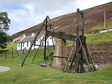The beam engine allowed miners to continue working in the Straitsteps mine, and assuming that there were two strokes of the beam per minute, this engine would have been able to lift around 7,280 litres per hour (1,600 imp gal/h) and requiring little attention it would have been left to do this twenty-four hours a day.[15] The wooden bucket was fed from a cistern above and once the weight of water was greater than the water above the pump piston the beam was lifted, carrying water from up to 28 metres (92 ft) below ground into a wood lined culvert which carried it off to the nearby burn. Periodically the weight of the piston was adjusted so that it remained heavier than the empty bucket, ensuring that the beam fell to start the cycle again.[16]