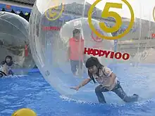 A water ball or water walking ball is a large inflatable sphere that allows a person inside it to walk across the surface of a body of water. The giant ball is usually two metres in diameter and has a zippered entrance to allow for easy entry and exit. The water ball[1] is similar to the zorb but it has only one layer and is designed for water travel rather than down-hill rolling. In the United Kingdom, the balls have been used at swimming pools, marinas and lakes in an effort to keep children fit.[2]