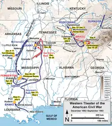 The West was by some measures the most important theater of the war. Capture of the Mississippi River has been one of the key tenets of Union General-in-Chief Winfield Scott's Anaconda Plan.[3] Military historian J. F. C. Fuller has described the Union invasion as an immense turning movement, a left wheel that started in Kentucky, headed south down the Mississippi River, and then east through Tennessee, Georgia, and the Carolinas. With the exception of the Battle of Chickamauga and some daring raids by cavalry or guerrilla forces, the four years in the West marked a string of almost continuous defeats for the Confederates; or, at best, tactical draws that eventually turned out to be strategic reversals. Union generals consistently outclassed most of their Confederate opponents, with the exception of cavalry commander Nathan Bedford Forrest.[4] Lacking the proximity to the opposing capitals and population centers (and the accompanying concentration of newspapers) of the East, the astounding Confederate victories, and the fame of Eastern generals such as Robert E. Lee, George B. McClellan, and Stonewall Jackson, the Western theater received considerably less attention than the Eastern, both at the time and in subsequent historical accounts. The near-steady progress that Union forces made in defeating Confederate armies in the West and overtaking Confederate territory went nearly unnoticed.[5]