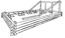 The ships once again found themselves at Bear Island on 1 July, which led to a disagreement between Barentsz and Van Heemskerk on one side and Rijp on the other. They agreed to part ways, with Barentsz continuing northeast, while Rijp headed due north in an attempt to cross directly over the north pole to reach China.[1][14] Barentsz reached Novaya Zemlya on 17 July. Anxious to avoid becoming entrapped in the surrounding ice, he intended to head for the Vaigatch Strait, but their ship became stuck within the many icebergs and floes.[9] Stranded, the 16-man crew was forced to spend the winter on a barren bluff.[7] After a failed attempt to melt the permafrost, the crew used driftwood and lumber from the ship to build a 7.8×5.5-metre lodge they called Het Behouden Huys (The Saved House).[4]
