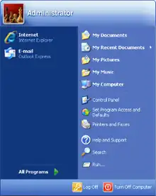 ![]() Screenshot of Windows XP running the Luna visual style, showing the start menu, taskbar, and My Computer window | |