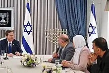 ![]() Hujeirat (on far right) meeting President Isaac Herzog with fellow MKs Mansour Abbas and Iman Khatib-Yassin | |