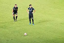 Endō (right) while he is about to free-kick against Vissel Kobe in 2017, flanked by his teammate Yōsuke Ideguchi (left)