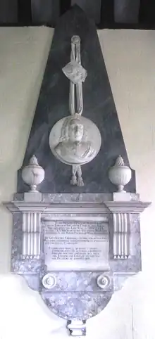 Medallion bust of Zachary Hamlyn (1677–1759) of Clovelly Court, Devon. Detail from his mural monument on north wall of north aisle, All Saints Church, Clovelly