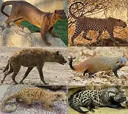 - either cat-like Carnivora in the broader sense, i.e. it is synonymous with Feliformia (more specifically either Feliformia sensu stricto, i.e. crown Feliformia, or Feliformia sensu lato, i.e. Pan-Feliformia);