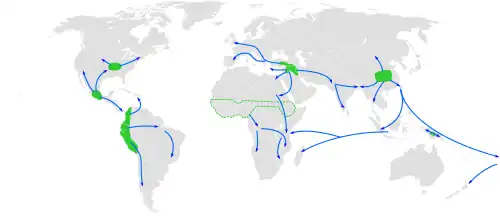 Map of the world showing approximate centers of origin of agriculture and its spread in prehistory.[33] DNA studies have shown that agriculture was introduced in Europe by the expansion of the early farmers from Anatolia about 9,000 years ago. [34]