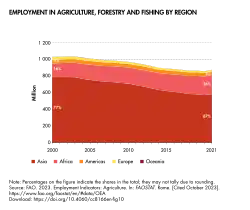 Agriculture employed 873 million people in 2021, or 27% of the global workforce, compared with 1 027 million (or 40%) in 2000. The share of agriculture in global GDP was stable at around 4% since 2000–2023.[107]