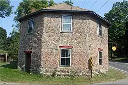 A photo of the historic octagonal cobblestone blacksmith shop in the hamlet of Alloway, New York.