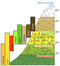 Altitudinal zonation (or elevational zonation[1]) in mountainous regions describes the natural layering of ecosystems that occurs at distinct elevations due to varying environmental conditions. Temperature, humidity, soil composition, and solar radiation are important factors in determining altitudinal zones, which consequently support different vegetation and animal species.[2][3] Altitudinal zonation was first hypothesized by geographer Alexander von Humboldt who noticed that temperature drops with increasing elevation.[4] Zonation also occurs in intertidal and marine environments, as well as on shorelines and in wetlands. Scientist C. Hart Merriam observed that changes in vegetation and animals in altitudinal zones map onto changes expected with increased latitude in his concept of life zones. Today, altitudinal zonation represents a core concept in mountain research.