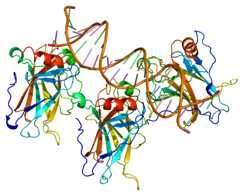 The p53 protein is a tumor-suppressing transcription factor (TF), which can recognize when there is an alteration in a cell's DNA caused by factors including chemical toxins, radiation, ultraviolet (UV) rays, and other damaging agents.[54] Crucially, p53 plays a role in determining whether the damaged genetic material in the cell can be repaired, or if the cell should be destroyed through apoptosis.[55][56] The individual topologically associating domains (TADs) target different genes and unique effector pathways. It has been observed that inactivating both of the TADs detrimentally affects the ability of p53 to suppress tumor growth and interact with target genes. When only one TAD is inactivated, p53 can still suppress specific tumors; however, it can no longer successfully engage in transactivation. The C-terminal domain (CTD) is an intrinsically disordered domain (IDD), which can take on different conformations depending on what it is binding with and is a location of many post-translational modifications, resulting in its ability to regulate p53 function depending on what it is bound to and what modifications are linked with the CTD. This domain also aids in the binding of the central DNA-binding domain (DBD) to specific DNA sequences; the CTD is a positive regulator of DNA binding and stabilizes the interaction of the DNA with the DBD.[54] p53 is unique as a transcription factor in that it can recognize and bind response elements (RE) in many different environments and doesn't need other transcription factors to cooperatively bind with it like many other TFs.[54]