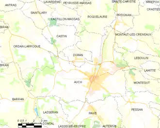 Auch borders thirteen other communes: Barran, Castillon-Massas, Castin, Duran, Lasséran, Leboulin, Montaut-les-Créneaux, Montégut, Ordan-Larroque, Pavie, Pessan, Preignan and Roquelaure.