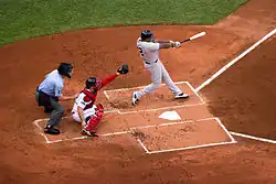 Play starts with a member of the batting team, the batter, standing in either of the two batter's boxes next to home plate, holding a bat.[13] The batter waits for the pitcher to throw a pitch (the ball) toward home plate, and attempts to hit the ball[14] with the bat.[13] The catcher catches pitches that the batter does not hit—as a result of either electing not to swing or failing to connect—and returns them to the pitcher. A batter who hits the ball into the field of play must drop the bat and begin running toward first base, at which point the player is referred to as a runner (or, until the play is over, a batter-runner).