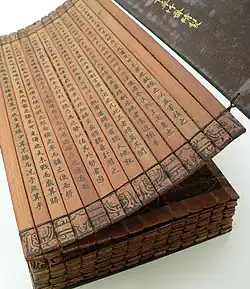 The custom of binding several wax tablets together (Roman pugillares) is a possible precursor of modern bound books.[21] The etymology of the word codex (block of wood) suggests that it may have developed from wooden wax tablets.[22]