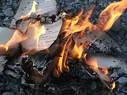 Book burning is the deliberate destruction by fire of books or other written materials, usually carried out in a public context. The burning of books represents an element of censorship and usually proceeds from a cultural, religious, or political opposition to the materials in question.[66] Book burning can be an act of contempt for the book's contents or author, intended to draw wider public attention to this opposition, or conceal the information contained in the text from being made public, such as diaries or ledgers. Burning and other methods of destruction are together known as biblioclasm or libricide.