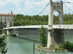 The group of bridges on the Rhône were created in 1842 and was required to achieve and a project is approved as early as July. The bridge, of "iron wire", was always based on three rock piles which were renewed from time to time, and had three spans of 96 m at the center and 42.5 m on the sides with a width of 4 m (13 ft).