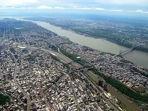 The Bronx (/brɒŋks/ BRONKS) is the northernmost of the five boroughs of New York City, coextensive with Bronx County, in the U.S. state of New York. It shares a land border with Westchester County to its north; to its south and west, the New York City borough of Manhattan is across the Harlem River; and to its south and east is the borough of Queens, across the East River. The Bronx, the only New York City borough not primarily located on an island, has a land area of 42 square miles (109 km2) and a population of 1,472,654 at the 2020 census.[2] It has the fourth-largest area, fourth-highest population, and third-highest population density of the boroughs.[5]