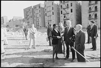 From the mid-1960s to the early 1980s, the quality of life changed for some Bronx residents. Historians and social scientists have suggested many factors, including the theory that Robert Moses' Cross Bronx Expressway destroyed existing residential neighborhoods and created instant slums, as put forward in Robert Caro's biography The Power Broker.[62] Another factor in the Bronx's decline may have been the development of high-rise housing projects, particularly in the South Bronx.[63] Yet another factor may have been a reduction in the real estate listings and property-related financial services offered in some areas of the Bronx, such as mortgage loans or insurance policies—a process known as redlining. Others have suggested a "planned shrinkage" of municipal services, such as fire-fighting.[64][65][66] There was also much debate as to whether rent control laws had made it less profitable (or more costly) for landlords to maintain existing buildings with their existing tenants than to abandon or destroy those buildings.