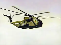 The CH-53A features a fully-articulated six-bladed main rotor and four-bladed tail rotor.[2] According to Carter, the relatively high speed requirement stipulated by the USMC was the primary factor shaping the dynamic design.[4] While the Sea Stallion's dynamic systems were largely derived from those used on the earlier Sikorsky S-64 Skycrane, substantial reengineering were also involved due to the vastly different operating requirements. Extensive use of titanium was made across its dynamic components, particularly for elements that may have been susceptible to degradation over time due to metal fatigue.[4] Initially, the CH-53 was powered by a pair of General Electric T64-6 turboshaft engines, each of which provided up to 2,850 shaft horsepower (2,130 kW). These engines were located on the upper fuselage. Later engines included the T64-1, capable of generating up to 3,080 shp (2,300 kW), and the T64-16, which was rated for up to 3,485 shp (2,599 kW).[3] The HH-53B model featured T64-3 engines, which produced up to 3,080 shp (2,300 kW).[7]