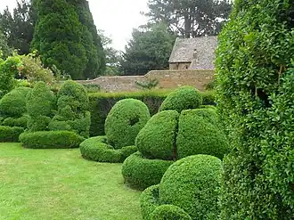 To the east of this was the Pleasaunce or Pleasure Garden. This was the Best Garden, which was levelled, but with a viewing terrace along one side which also gave entrance to the church at the opposite end. The design of this garden is not known, but it was almost certainly surrounded by high walls with fruit trees trained against it. The Best Garden was laid out in the circular pattern we see today by Dorothy Whitmore Jones in 1833,[14] although it is suggested that there were already box plants there. Beds were added within the circular hedge in the 1890s or 1900s and then grassed over again by 1972. During the periods of time when money came into the family the planting in this garden was always renewed.