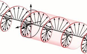 The electric field vectors of a traveling circularly polarized electromagnetic wave. This wave is right-handed/clockwise circularly polarized as defined from the point of view of the source, or left-handed/anti-clockwise circularly polarized if defined from the point of view of the receiver.
