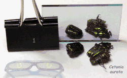 A 3-slide series of pictures taken with and without a pair of MasterImage 3D circularly polarized movie glasses of some dead European rose chafers (Cetonia aurata) whose shiny green color comes from left-polarized light. Note that, without glasses, both the beetles and their images have shiny color. The right-polarizer removes the color of the beetles but leaves the color of the images. The left-polarizer does the opposite, showing reversal of handedness of the reflected light.