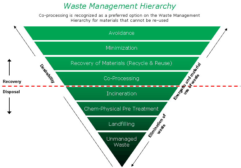 The waste management hierarchy (see figure below) shows that Co-processing is a recovery activity which should be considered after waste prevention and recycling; Co-processing ranks higher in this hierarchy in comparison to disposal activities such as landfilling or incineration.