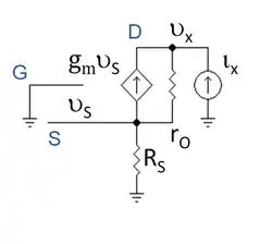 At low frequencies and under small-signal conditions, the circuit in Figure 1 can be represented by that in Figure 2, where the hybrid-pi model for the MOSFET has been employed.
