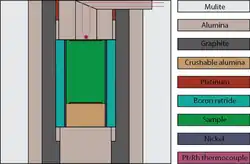 In the sample assembly, inboard of the pressure medium and surrounding the sample is an internal resistive heater. The heater is a sleeve which the cylindrical sample fits into, and typically is made of graphite, or can also be made of different types of metal.