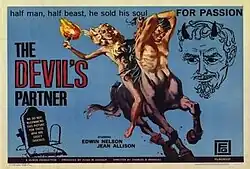 Devil's Partner is a 1958 black-and-white American supernatural horror film starring Ed Nelson, directed by Charles R. Rondeau and produced by Hugh Hooker, an actor and stuntman who had previously made the 1958 film The Littlest Hobo. However the film was not released until 1961 when it was acquired by Roger and Gene Corman's Filmgroup and released as a double feature with Creature from the Haunted Sea.[1] The film was co-written by actor Stanley Clements and Laura Jean Mathews.