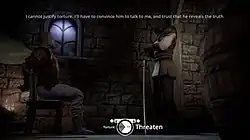 An example of the choice-making mechanic: Kian considers using torture in an interrogation, while the player is informed how many other players made this choice[5]