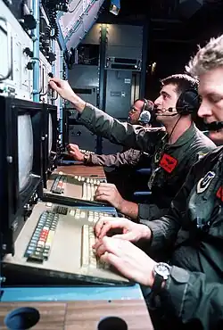 The EC-130H aircraft carries a combat crew of 13 people. Four members handle aircraft flight and navigation (aircraft commander, co-pilot, navigator, and flight engineer), while nine members operate and employ the EA mission equipment permanently integrated into the cargo/mission compartment. The mission crew includes the mission crew commander (electronic warfare officer), weapon system officer (electronic warfare officer), mission crew supervisor (an experienced cryptologic linguist), four analysis operators (linguists), one acquisition operator, and an airborne maintenance technician.[6]