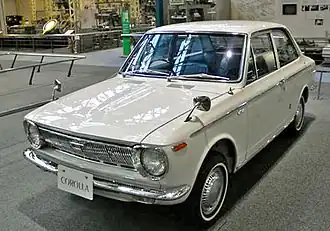 The 1947 FR layout Toyota SA was Toyota's first true post war design.[71] Although permission to begin full production of passenger cars in Japan was not granted until 1949, limited numbers of cars were permitted to be built from 1947, and the Toyota SA was one such car.[72][73][74] It had a 4-cylinder engine, 4-wheel independent suspension and a smaller, aerodynamic body. The project was driven by Kiichiro Toyoda, but most of the design work was done by Kazuo Kumabe.[75] The two-door body was aerodynamic in a style similar to the Volkswagen Beetle. The doors were hinged at the rear (often called suicide doors). The front window was a single pane of flat glass with a single wiper mounted above the driver. Only right hand drive was offered. Toyota engineers (including Dr Kumabe) had visited Germany before World War II and had studied Porsche and Volkswagen designs (independent suspension, aerodynamic bodies, backbone chassis, rear-mounted air-cooled engines, economical production cost).[72] Many Japanese companies had ties with Germany during the war years. But unlike other Japanese car firms Toyota did not partner with Western companies after the war, so it was free to use German designs. Many features of the prototype Beetle were subsequently put into the SA, although the Beetle's rear-mounted air-cooled engine feature was not used. Later on, Toyota revisited the economic principles exemplified by the Beetle when designing the 1950s successors to the SA and the later Publica and Corolla.