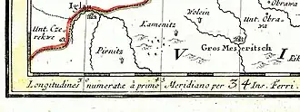 Part of map of Upper Silesia (1746) with Latin message: Longitudines numeratæ à primo Meridiano per Ins[ula] Ferri ("Longitudes numbered from the prime meridian at Ferro Island.").