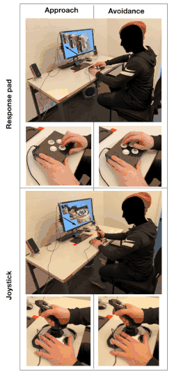 The AAT has been investigated in different scenarios and with different types of stimuli such as words and images. A study focusing on the AAT on embodied cognition, for example, examined people's response to positive and negative words presented on the center of a screen by moving them away or towards the center. The study concludes that participants moved the given positive words towards the center of the screen while moving the negative words away from the center of the screen. In conformity with the AAT, participants showed an approach effect for positive words and avoidance effects for negative words.[136] In a 2021 study on emotional or affective priming, the AAT was used to demonstrate the interaction between emotions and visual exploration. Pictures of news pages were presented on the computer screen and eye movements were measured. Researchers found out that the participants' harmonious bodily interaction during the emotional preparation process shows that their interest in the image's content displayed on the computer screen increased. These findings demonstrate the effect of emotional priming in the approach and avoidance behavior.[137] A study on the behavioral aspects of the AAT suggests that there is an embodied component that is crucial to it.[138] To investigate the role of gestures in AAT, participants were asked to react to positive and negative stimuli by either pressing a (far or near) button on a response pad; or by pushing forward or pulling backward a joystick. Researchers reported a significant response time advantage for the congruent responses when performed with the joystick and none when performed with the response pad. The fact that participants are faster at responding to the stimuli with the joystick seems to suggest the role of a crucial embodied component. In contrast to the response pad, the joystick couples more naturally with the body (hand) for the performance of the action and facilitates the gesture of approaching or avoiding positive or negative stimuli.