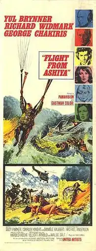 Flight from Ashiya (aka Ashiya Kara no hiko) is a 1964 film about the U.S. Air Force's Air Rescue Service, flying from Ashiya Air Base, Japan. In this American-Japanese co-production film set in the early 1960s, a flight crew's mission is to rescue a liferaft of Japanese civilians stranded in rough seas.[3] The film was based on the 1956 novel Rescue! by Elliott Arnold (repressed as Flight from Ashiya in 1959). It was released in Japan as Ashiya Kara no hiko.[4]