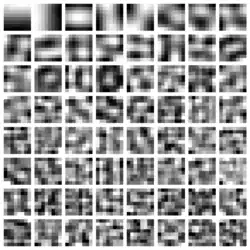 Features learned by generalized Hebbian algorithm running on 8-by-8 patches of Caltech 101.