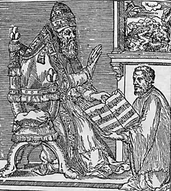 From 1544 to 1551, Palestrina was the organist of the Cathedral of St. Agapito, the principal church of his native city. In 1551 Pope Julius III (previously the Bishop of Palestrina) appointed Palestrina maestro di cappella or musical director of the Cappella Giulia,[5] (Julian Chapel, in the sense of choir), the choir of the chapter of canons at St. Peter's Basilica. Palestrina dedicated to Julius III his first published compositions (1554), a book of Masses. It was the first book of Masses by a native composer, since in the Italian states of Palestrina's day, most composers of sacred music were from the Low Countries, France, or Spain.[6] In fact the book was modelled on one by Cristóbal de Morales: the woodcut in the front is almost an exact copy of the one from the book by the Spanish composer.