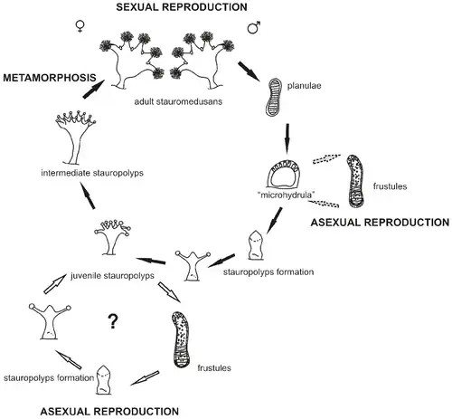 A recent genetic analysis has suggested that Microhydrula limopsicola, originally classified as a member of the order Limnomedusae, is in fact a developmental stage of Haliclystus antarcticus.[1] In its mature form H. antarcticus has eight gonads which are organised into four pairs and run from the central mouth to the ends of the arms. The gonads are approximately 1.6–12.9 mm in length and are visible through the wall of the calyx. The gonads are mature in specimens which have a calyx height of about 11.72 mm and greater.[2]