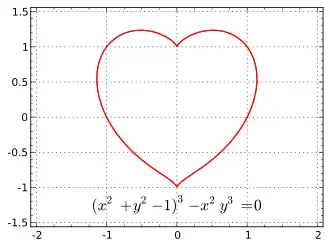 A number of parametrisations of approximately heart-shaped curves have been described. The best-known of these is the cardioid, which is an epicycloid with one cusp;[39] though as the cardioid lacks the point, it may be seen as a stylized water-lily leaf, a so-called seeblatt, rather than a heart. Other curves, such as the implicit curve (x2+y2−1)3−x2y3=0, may produce better approximations of the heart shape.[40]