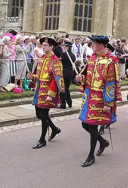 The spread of armorial bearings across Europe gave rise to a new occupation: the herald, originally a type of messenger employed by noblemen, assumed the responsibility of learning and knowing the rank, pedigree, and heraldic devices of various knights and lords, as well as the rules governing the design and description, or blazoning of arms, and the precedence of their bearers.[32] As early as the late thirteenth century, certain heralds in the employ of monarchs were given the title "King of Heralds", which eventually became "King of Arms."[32]