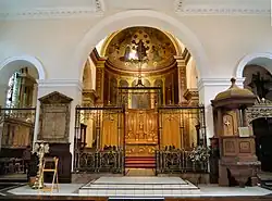 The church is now effectively one huge room with tripartite openings at the east end, allowing access to the chancel and the two side chapels. The central feature of the decoration of the apse is 'the Presence of the Crucified in the Church of all ages': Christ upon the cross is flanked by Aaron, David, and Isaiah on the north side, and Saints Paul, Stephen, and Augustine of Hippo on the south side, representing respectively the priests, kings and prophets of the Jewish Church and the apostles, martyrs and bishops of the Christian Church. The lower paintings in the apse and on the altar are by C E Buckeridge done in 1889–91. The painting in the vault was added later by a different artist, which is why they are in a different style.