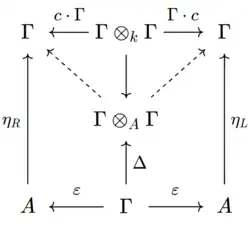 As an example of left bialgebroid, take R to be any algebra over a field k. Let H be its algebra of linear self-mappings. Let s(r) be left multiplication by r on R; let t(r) be right multiplication by r on R. H is a left bialgebroid over R, which may be seen as follows. From the fact that H ⊗R H ≅ Homk(R ⊗ R, R) one may define a coproduct by Δ(f)(r ⊗ u) = f(ru) for each linear transformation f from R to itself and all r, u in R. Coassociativity of the coproduct follows from associativity of the product on R. A counit is given by ε(f) = f(1). The counit axioms of a coring follow from the identity element condition on multiplication in R. The reader will be amused, or at least edified, to check that (H, R) is a left bialgebroid. In case R is an Azumaya algebra, in which case H is isomorphic to R ⊗ R, an antipode comes from transposing tensors, which makes H a Hopf algebroid over R. Another class of examples comes from letting R be the ground field; in this case, the Hopf algebroid (H, R) is a Hopf algebra.