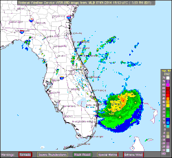 Throughout July 1, steady structural organization ensued. Around 15:00 UTC winds of 38 mph (61 km/h) were measured at Settlement Point on Grand Bahama, prompting the NHC to upgrade the depression to a tropical storm and assign it the name Arthur.[8] Though environmental conditions surrounding the cyclone favored development, moderate wind shear and intrusions of dry air into the circulation prolonged organization.[9] The effects of the shear showed clearly on WSR-88D radar imagery from Melbourne, Florida which depicted a mid-level eye feature displaced 30 to 35 mi (48 to 56 km) from the low-level center.[10] By July 2, Arthur acquired a steady northward track as previously forecast.[11] Throughout the day, convection consolidated around a developing eye as wind shear abated and the storm neared hurricane strength, with winds reaching 70 mph (115 km/h).[12]
