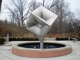 Number five in a series, Imploding Cube consists of a 1.5-metre cube made of aircraft aluminium mounted on one of its apices. Each face of the cube points inwards to create a cube- shaped negative space at the centre of itself. A bearing sits underneath the apex, which stands on a pole, allowing the cube to revolve in the wind.[2] The sculpture stands in a reflecting pool.[3]
