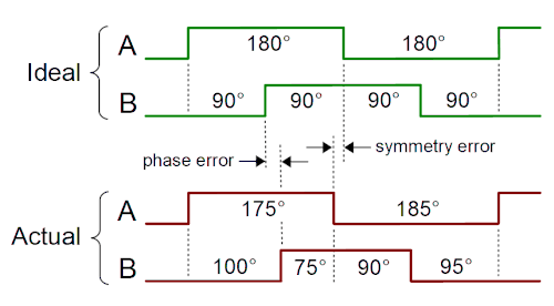 When moving at constant velocity, an ideal incremental encoder would output perfect square waves on A and B (i.e., the pulses would be exactly 180° wide and the duty cycle would be 50%) with a phase difference of exactly 90° between A and B signals. In real encoders, however, due to sensor imperfections and speed variations, the pulse widths are never exactly 180° and the phase difference is never exactly 90°. Furthermore, the A and B pulse widths vary from one cycle to another (and from each other) and the phase difference varies at every A and B signal edge. Consequently, both the pulse width and phase difference will vary over a range of values.