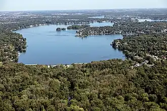 Much of the decidious forests that once covered 98% of the region were cleared for agriculture and urban development, contributing to considerable habitat loss.[131][133] Indianapolis's current urban tree canopy averages approximately 33%.[134] A rare example of old-growth forest in the city can be found on 15 acres (6.1 ha) of Crown Hill Cemetery's North Woods in the Butler–Tarkington neighborhood.[135] The cemetery's 555 acres (225 ha) represents the largest green space in Center Township, home to an abundance of wildlife and some 130 species of trees.[136] Native trees most common to the area include varieties of ash, maple, and oak.[131] Several invasive species are also common in Indianapolis, including tree of heaven, wintercreeper, Amur honeysuckle, and Callery pear.[137][138]